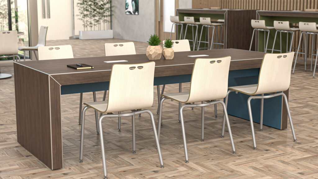 The redesigned WDS Chair delivers a sophisticated blend of modern design and industrial durability, making it an ideal choice for high-traffic environments. The seat is engineered with a high-pressure laminate shell featuring a sturdy 7-ply plywood core, available in Formica’s standard 58 finish. This durable shell is supported by a 16-gauge steel frame utilizing secure metal-to-metal connections and finished with a sleek silver powder coat. To ensure longevity and floor protection, each chair is equipped with protective nylon glides.